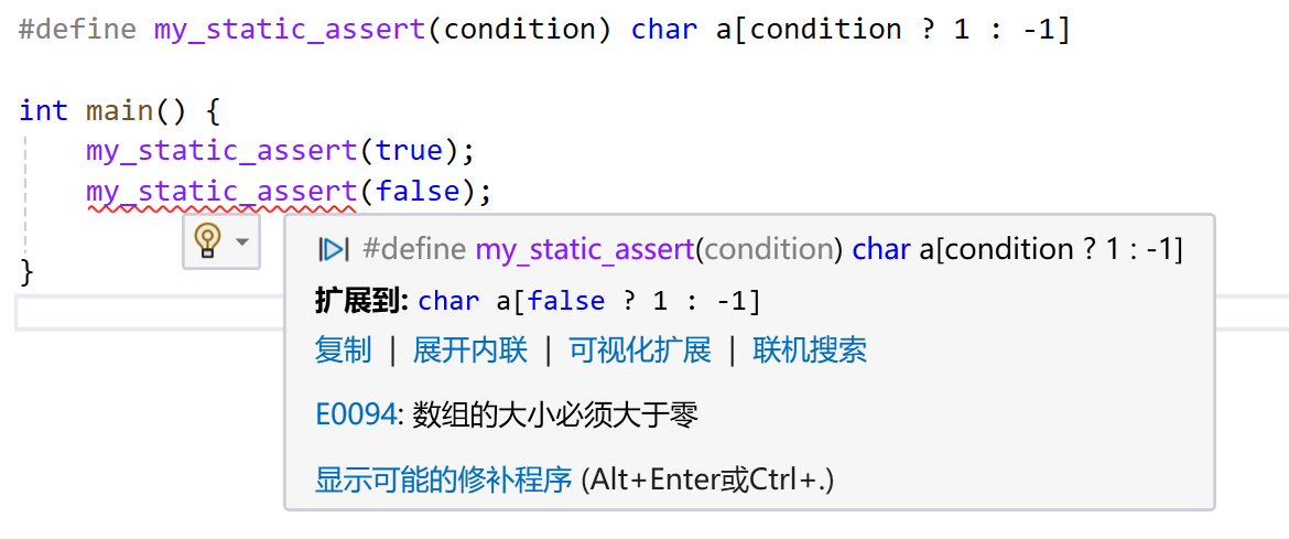 所以,利用这个特性就可以实现一个简易的 static_assert,当条件不满足时创建一个负数长度数组保证在编译期抛出错误