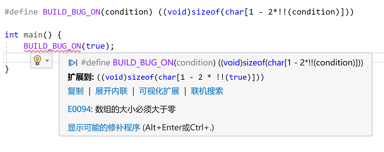当表达式为 1 时,宏被展开为 sizeof(char[-1]),否则被展开为 sizeof(char[1])