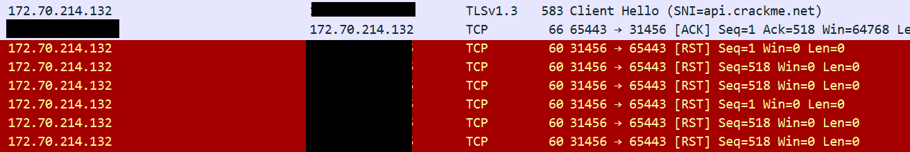 服务器上用tcpdump抓包显示,cloudflare到源服务器过程中并未启用加密SNI,并且RST紧随着client hello被发送(还一次发送6个,笑)