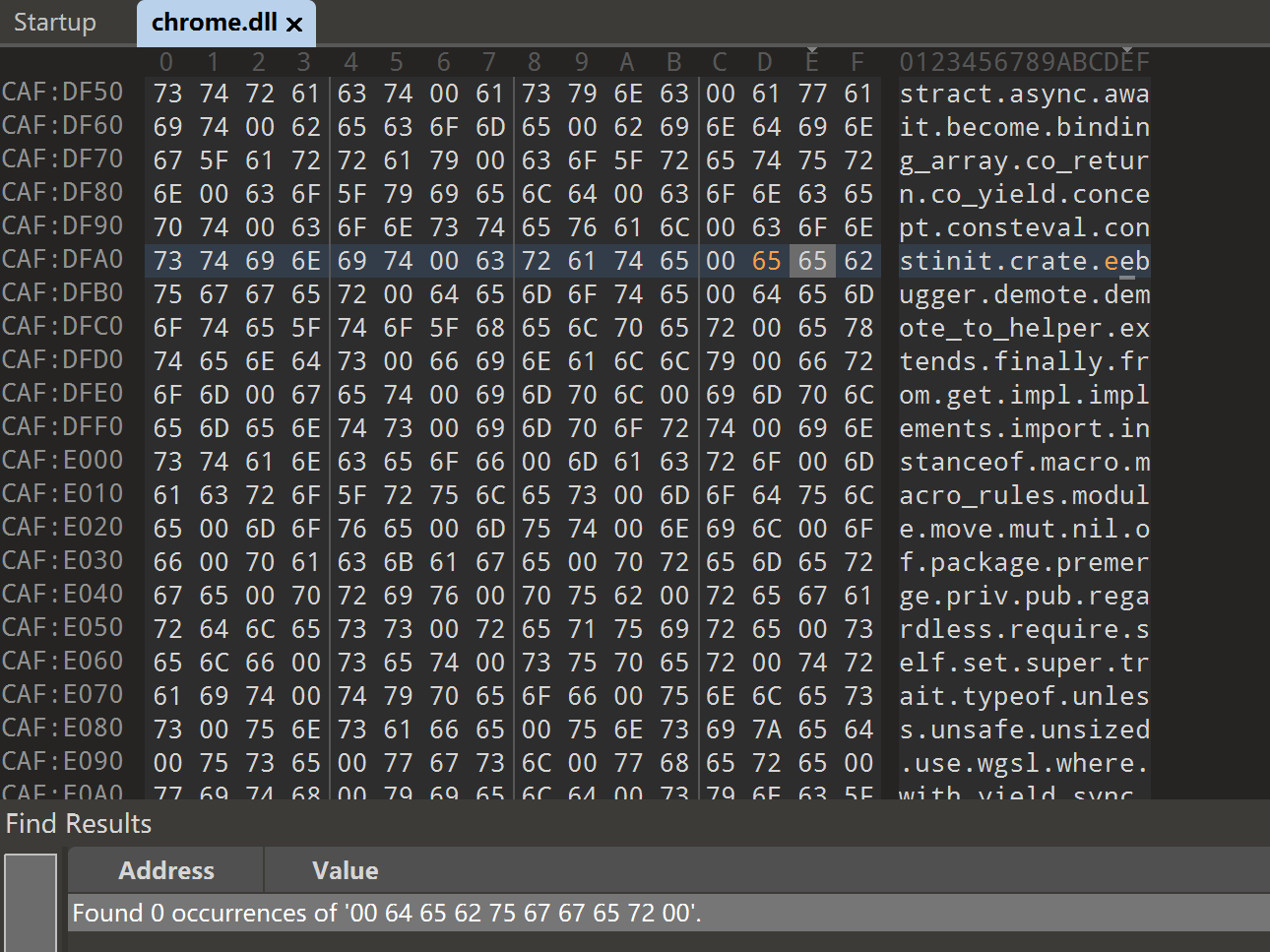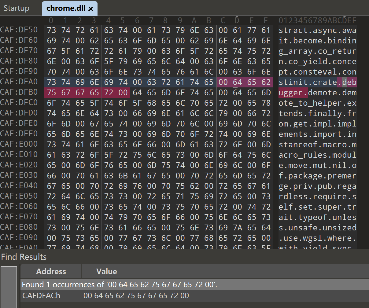 使用任意二进制文件编辑器打开chrome.dll,查找debugger关键字