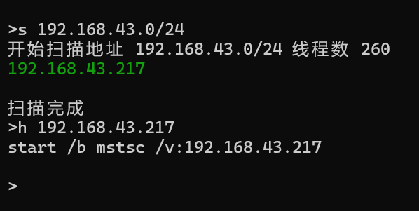 printf("\n扫描完成"); } else if (cmd[0] == "check" || cmd[0] == "c") { if (cmd.size() != 2) { printf("输入不合法\ncheck指令用法:check IP地址"); continue; } if (IsPortOpen(cmd[1].c_str(), 3389)) { CONSOLE_COLOR_GREEN(printf("开启\n")); } else { CONSOLE_COLOR_RED(printf("关闭\n")); } } else if (cmd[0] == "hack" || cmd[0] == "h") { if (cmd.size() != 2) { printf("输入不合法\nhack指令用法:hack IP地址"); continue; }